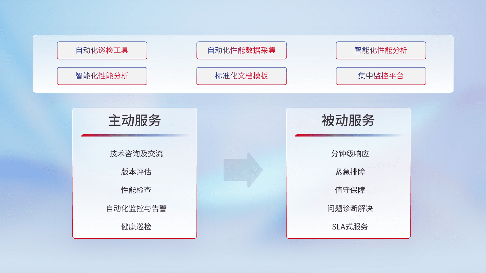 智能化工具和标准化文档,,,保障服务质量,,,提供主动服务(包含技术咨询、、、、版本评估、、、、性能检查、、、自动化监控与告警、、、健康巡检)和被动服务包含(分钟级响应、、紧急排障、、、、值守保障、、、、问题诊断解决、、、、SLA服务)。。